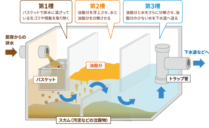 下水道に直接油が流出する事を防ぐ装置で、昭和51年から飲食店に設置が義務化。